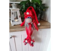 Dekorační textilní skřítek. Výka v sedě 20 cm, celková délka 50 cm.