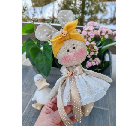 Závěsná dekorační textilní zaječice s vyšívaným nosánkem. Zaječice udělá radost v jarních dnech, jako dekorace pro radost.